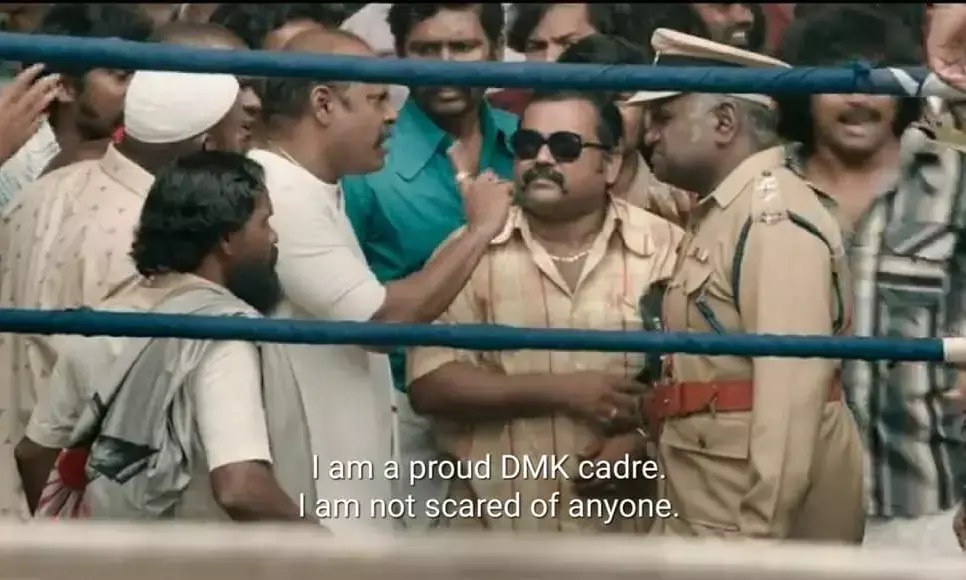 அனைத்திந்திய அண்ணா திராவிட முன்னேற்ற கழகத்தின் மீது இயக்குனர் பா.ரஞ்சித்'க்கு என்ன கோபம்? "நான் தி.மு.க'காரன் பயப்படமாட்டேன்" என கருப்பு, சிவப்பு கரை வேட்டியுடன் கைது செய்ய வரும் காவல்துறை அதிகாரியிடம் பசுபதி பொங்குவதாகட்டும், 'செங்கோட்டை தகர்க்கப்படும்' என மைக் பிடித்து பொங்குவதாகட்டும், நம்ம ஆட்சிய கலைச்சிட முடியுமா? தலைவர் விட்ருவாரா என கருணாநிதி புராணம் பாடுவதாகட்டும், "மிசா'வாம்! பாவம் கருணாநிதி புள்ளை ஸ்டாலினே தூக்கி உள்ள வச்சுட்டாங்கப்பா" என வலிய வந்து வாசிப்பதாகட்டும் தி.மு.க பிரமுகர், கரை வேட்டிகளை சமூக காவலாளிகளாக காண்பித்து அழகு பார்த்த இயக்குனர் பா.ரஞ்சித் அ.தி.மு.க'காரர்களை அப்படியே மாற்றி காண்பித்துள்ளார்.