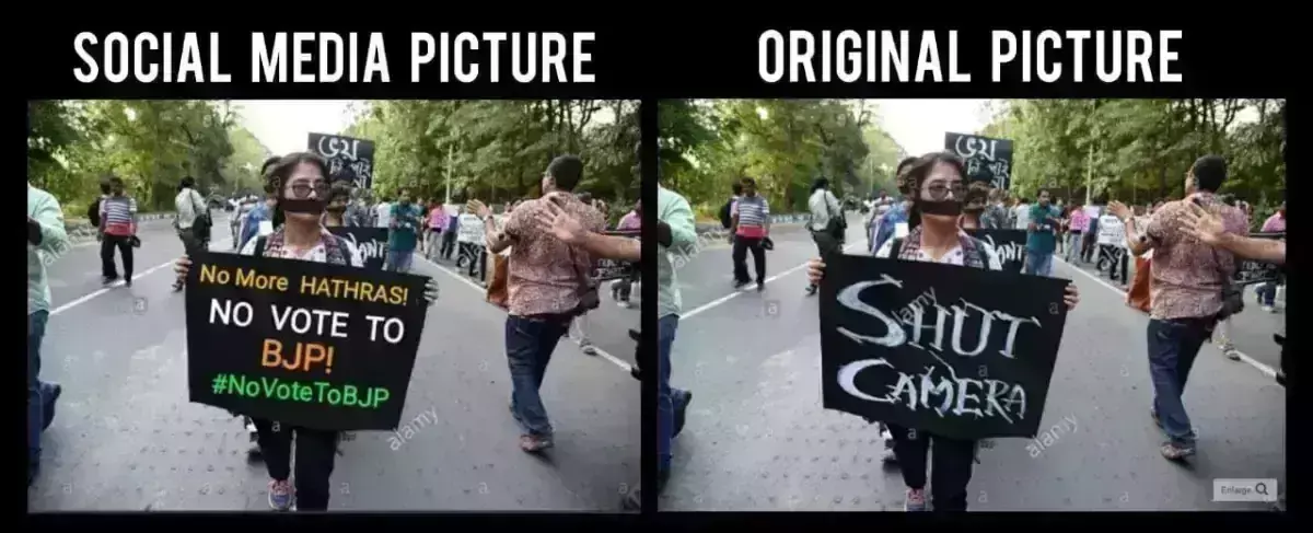 உண்மை புகைப்படத்தில் அந்த பெண்மணியைக் கையில் உள்ள பதாகையில், "சட் கேமரா" என்று குறிப்பிட்டிருந்தது. இதே புகைப்படம் "நேஷனல் ஹெரால்ட்" என்ற செய்திக் கட்டுரையிலும் காணப்பட்டது. எனவே இந்த புகைப்படம் மார்பின் செய்யப்பட்டுள்ளது மற்றும் இதற்கும் பா.ஜ.கவிற்கு வாக்களிக்க வேண்டாம் என்ற பிரச்சாரத்துக்குச் சம்பந்தம் இல்லை. உண்மையில் அந்த புகைப்படம் ஆளும் திரிணாமூல் காங்கிரஸ்க்கு எதிராகப் பத்திரிகையாளர்களின் போராட்டத்தின் போது எடுக்கப்பட்டது என்பது கண்டறியப்பட்டுள்ளது.