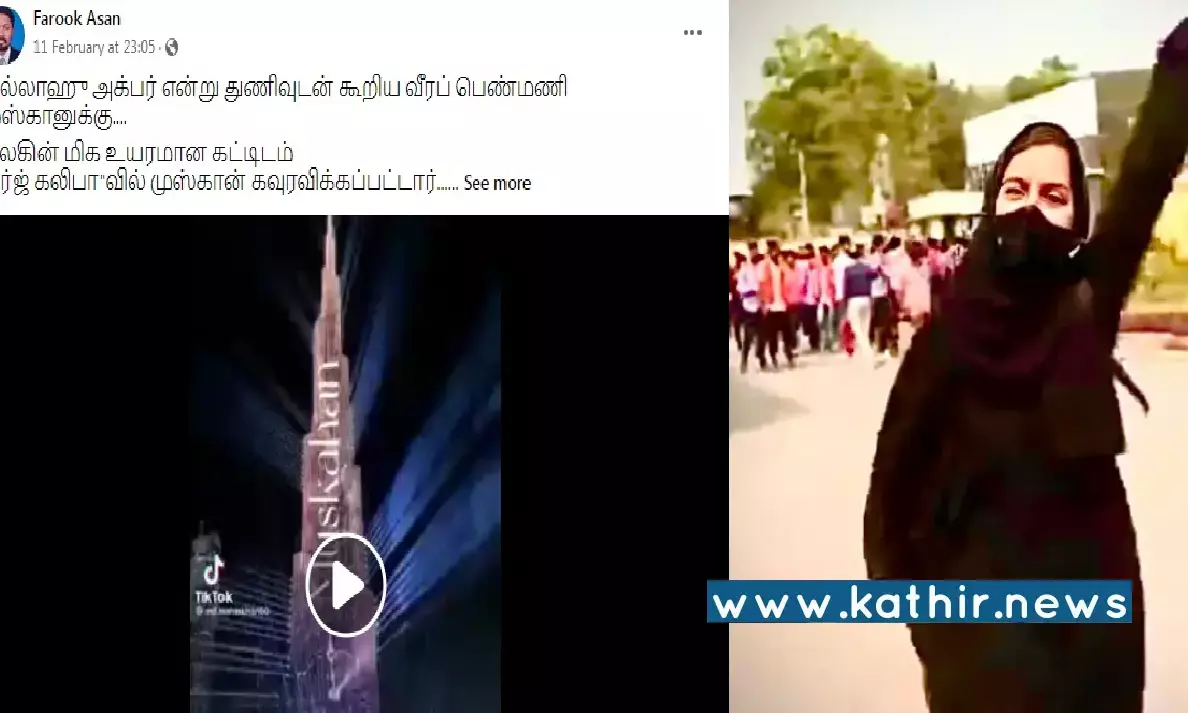 "அல்லாஹு அக்பர் என்று துணிவுடன் கூறிய வீரப் பெண்மணி முஸ்கானுக்கு, உலகின் மிக உயரமான கட்டிடம்.."புர்ஜ் கலிபா"வில் முஸ்கான் கவுரவிக்கப்பட்டார்" என்ற வாசகங்கள் அடங்கிய வீடியோ பகிரப்பட்டு வருகிறது.