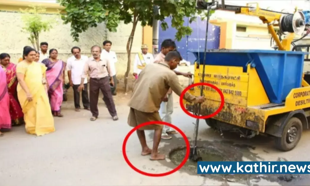 மேயர் முன்னிலையிலேயே தூய்மைப் பணியாளர்கள் பாதுகாப்பு உபகரணங்கள் இல்லாமல் கழிவுநீர் தொட்டியை சுத்தம் செய்த விவகாரம் பெரும் சர்ச்சைக்கு காரணமாக அமைந்துள்ளது.