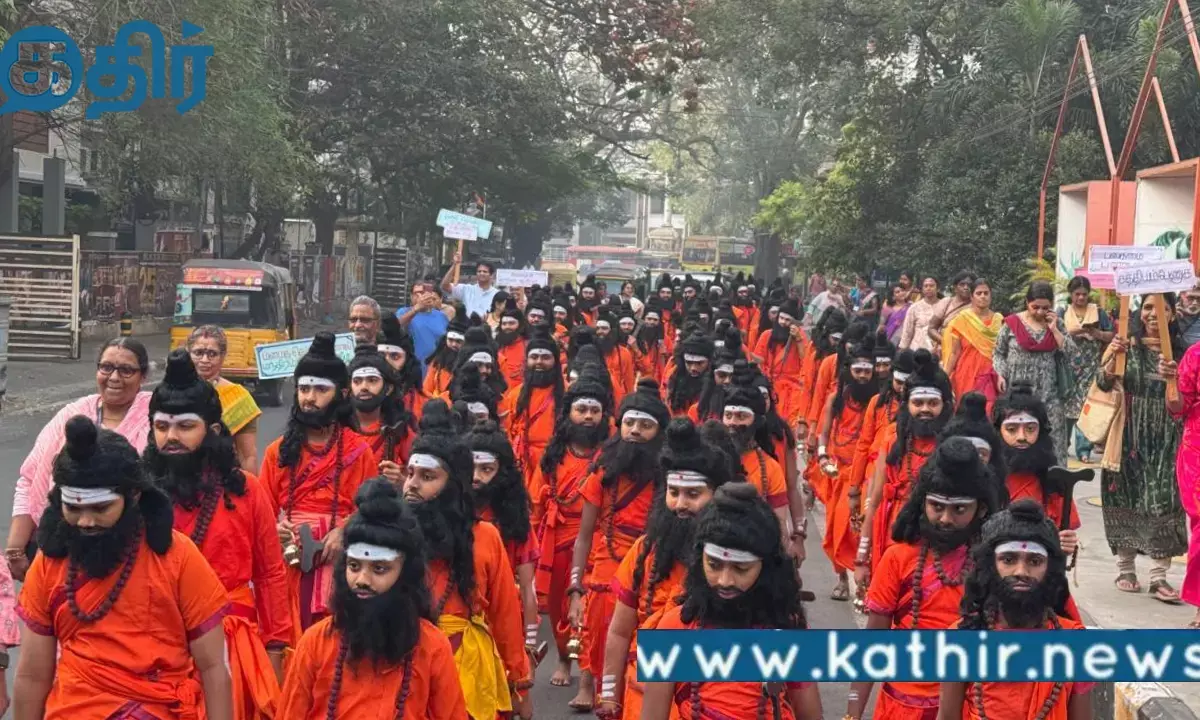 காசி தமிழ்ச் சங்கமத்தின் 3-வது ஆண்டை முன்னிட்டு அகத்திய முனிவர் போல உடை அணிந்து நூற்றுக்கும் மேற்பட்ட பள்ளி மாணவர்கள் சென்னையில் நடைபெற்ற நடைப்பயணத்தில் பங்கேற்றனர்