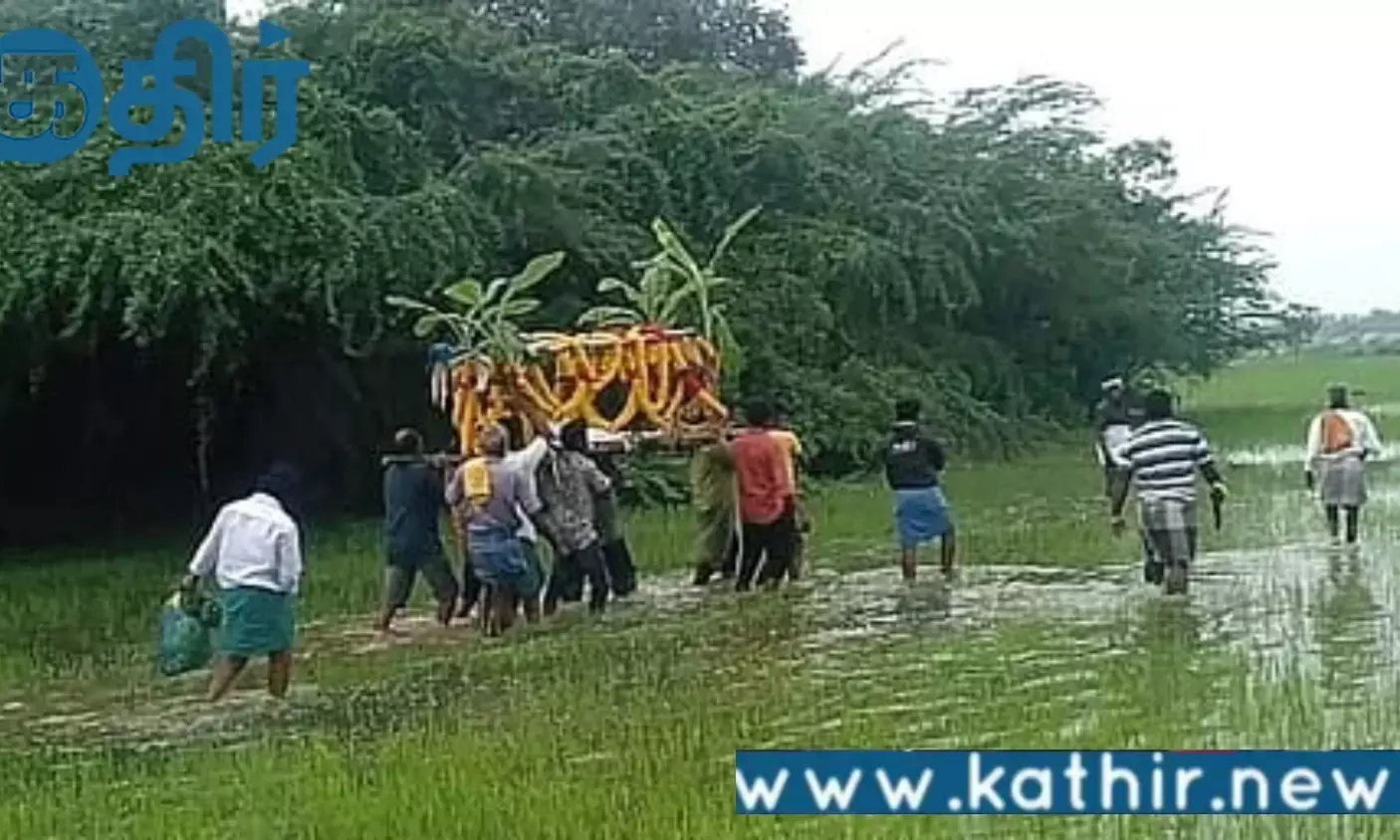 தற்பொழுது பருவமழை காலம் தொடங்கிய நிலையில் பெய்து வரும் மழையால் அப்பகுதியில் வயல்வெளிகளில் நீர் நிறைந்து காணப்படும் நிலையில் கடந்த திங்கட்கிழமை 80 வயது உடைய கனகராஜ் என்பவர் மரணமடைந்த நிலையில் உடலை நல்லடக்கம் செய்வதற்காக நீர் நிறைந்த வயல் வழியாக அவருடைய உடலை எடுத்துச் செல்லும் போது எடுக்கப்பட்ட புகைப்படம் ஆனது சமூக வலைதளங்களில் பரவி வருகிறது.