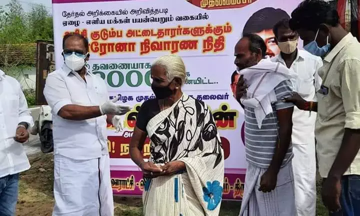 ஆனால் தற்பொழுது ஆட்சியில் இருக்கும் தி.மு.க'வினர் ரேசன் கடைகளில் 2000 ரூபாய் நிவாரணம் அளிக்கும் திட்டத்திற்கு ப்ளக்ஸ் வைத்து, ரேசன் கடைகளில் தி.மு.க கொடிகளை கட்டி, சில தி.மு.க கரை வேட்டிகளை ரேசன் கடைகளில் நிற்க வைத்து, இன்னும் சொல்லப்போனால் பேரிடர் காலத்தில் மக்களுக்கு விரைந்து சேவை செய்ய வேண்டிய அமைச்சர்கள் கூட ரேசன் கடைகளில் நிவாரண பணம் தர நிற்கின்றனர்.