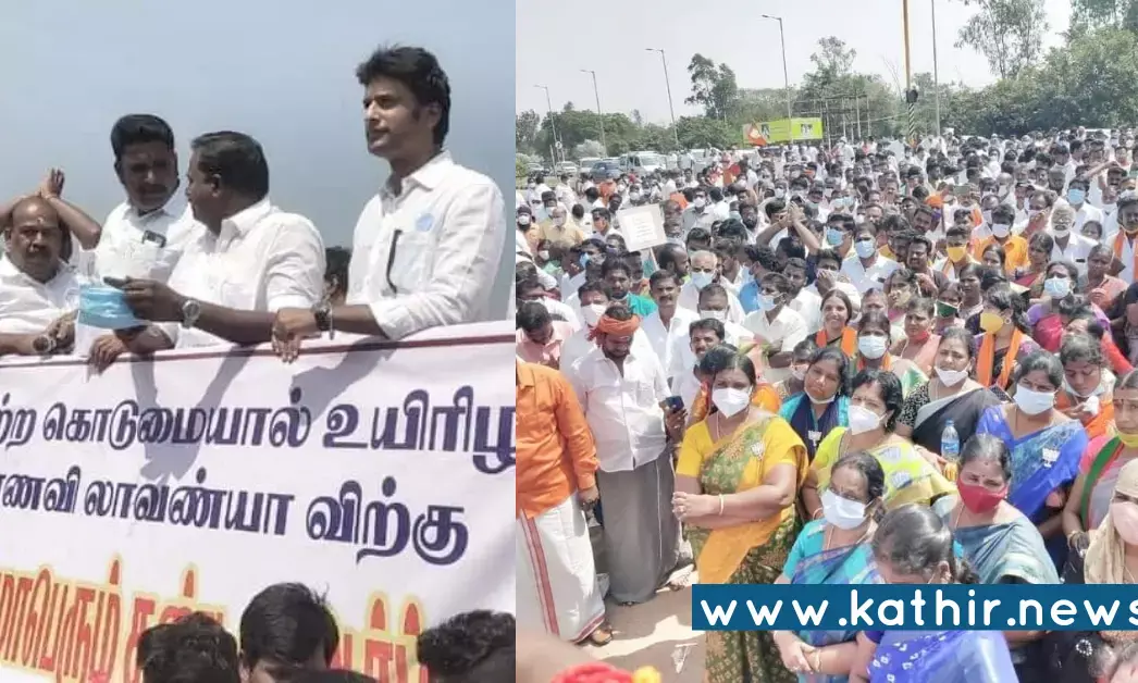 இந்நிலையில் இவரது மரணம் குறித்த வழக்கை சி.பி.ஐ. விசாரணைக்கு உத்தரவிடக்கோரியும், கட்டாய மதமாற்றத்தினால் உயிரிழந்த லாவண்யா குடும்பத்துக்கு இழப்பீடு தொகையாக ரூ.1கோடி வழங்கக்கோரியும், மாணவியின் குடும்பத்தில் ஒருவருக்கு அரசு வேலை வழங்க வலியுறுத்தியும், கட்டாய மதமாற்றம் தடை சட்டத்தை தமிழக அரசு கொண்டு வரக்கோரியும் தஞ்சை மாவட்ட கலெக்டர் அலுவலகத்தை முற்றுகையிட்டு போராட்டம் நடத்தப்படும் என பா.ஜ.க.வினர் அறிவித்து போராட்டத்தில் ஈடுபட்டனர்.