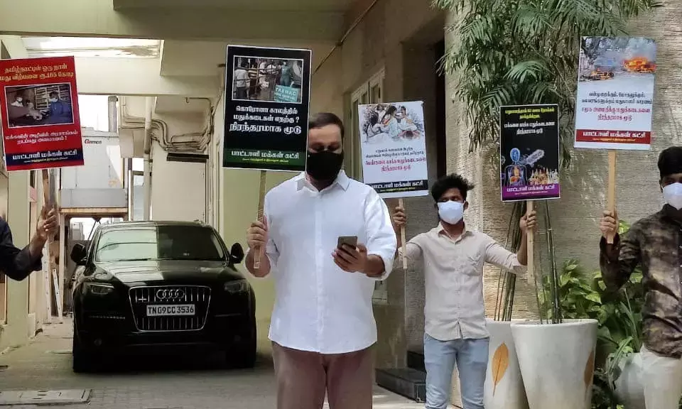 தமிழகத்தில் கொரோனா பெருந்தொற்று காலத்தில் மதுக்கடைகள் திறப்பை எதிர்த்து பாமக சார்பில் மாநிலம் முழுவதும் ஆர்ப்பாட்டம் நடைபெற்றது.