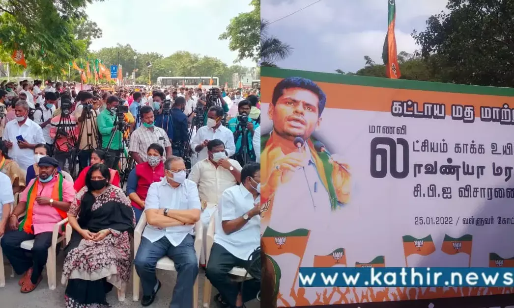 "இந்நிலையில் மாணவியின் தற்கொலைக்கு நீதி வேண்டி இவ்வழக்கை சி.பி.ஐ விசாரிக்க வேண்டும்" என்று தமிழக பா.ஜ.க சார்பில் சென்னை வள்ளுவர் கோட்டத்தில் மாபெரும் உண்ணாவிரதம் நடைபெற்று வருகிறது.