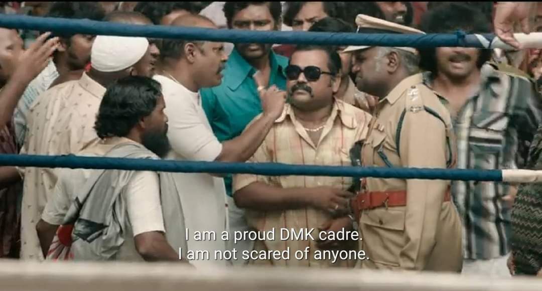 அனைத்திந்திய அண்ணா திராவிட முன்னேற்ற கழகத்தின் மீது இயக்குனர் பா.ரஞ்சித்'க்கு என்ன கோபம்? "நான் தி.மு.க'காரன் பயப்படமாட்டேன்" என கருப்பு, சிவப்பு கரை வேட்டியுடன் கைது செய்ய வரும் காவல்துறை அதிகாரியிடம் பசுபதி பொங்குவதாகட்டும், 'செங்கோட்டை தகர்க்கப்படும்' என மைக் பிடித்து பொங்குவதாகட்டும், நம்ம ஆட்சிய கலைச்சிட முடியுமா? தலைவர் விட்ருவாரா என கருணாநிதி புராணம் பாடுவதாகட்டும், "மிசா'வாம்! பாவம் கருணாநிதி புள்ளை ஸ்டாலினே தூக்கி உள்ள வச்சுட்டாங்கப்பா" என வலிய வந்து வாசிப்பதாகட்டும் தி.மு.க பிரமுகர், கரை வேட்டிகளை சமூக காவலாளிகளாக காண்பித்து அழகு பார்த்த இயக்குனர் பா.ரஞ்சித் அ.தி.மு.க'காரர்களை அப்படியே மாற்றி காண்பித்துள்ளார்.