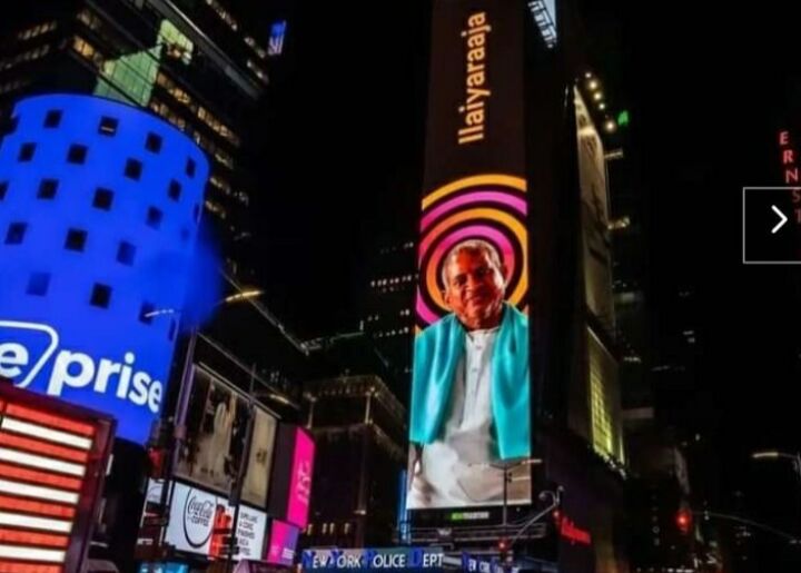 இந்நிலையில் முதன்முறையாக இளையராஜாவின் பேனர் அடங்கிய வீடியோ, அமெரிக்காவின் நியூயார்க் நகரில் உள்ள டைம்ஸ் சதுக்கத்தின் உயரமான கட்டட திரையில் நேற்று காட்சிப்படுத்தப்பட்டது. இதை இளையராஜாவின் உலகளவிலான ரசிகர்கள் கொண்டாடி வருகின்றனர்.