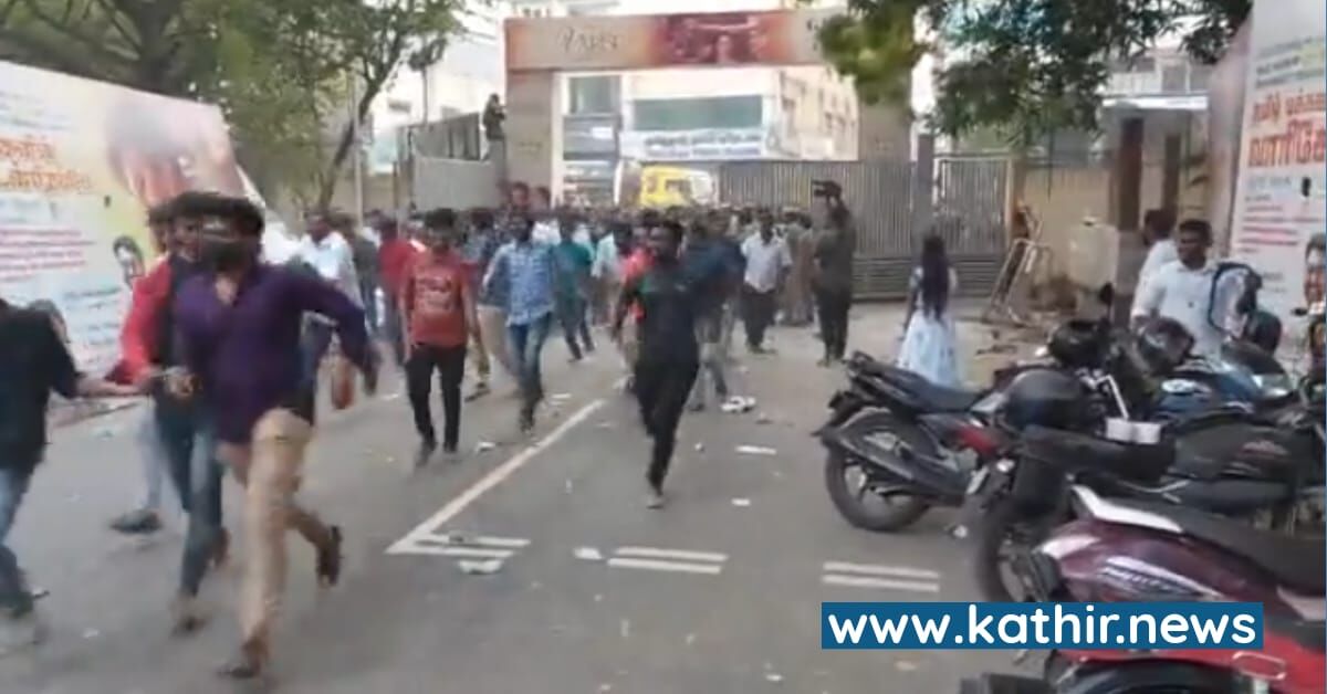 அனுமதி அட்டையை வைத்திருப்பவர்கள் மட்டுமில்லாமல் அனுமதிக்க இல்லாத ரசிகர்களும் உள்ளே நுழைவு வேண்டும் என்ற எண்ணத்தில் போலீசாரை முட்டி தள்ளினர். வெறிகொண்டு போலீசாரை ரசிகர்கள் தட்டி விட்டு அவர்களை ஏறி மிதித்து கொண்டு உள்ளே நுழைந்ததால் பரபரப்பு ஏற்பட்டது. இதில் வாசலை மறித்து நின்ற சில போலீசார் காயமடைந்தனர், உடனடியாக சுதாரித்துக் கொண்ட போலீசார் மெயின் கேட்டை இழுத்து மூடியதோடு சாலையில் நின்றவர்களை லத்தி கொண்டு அடித்து தள்ளினர். இந்த சம்பவத்தால் அந்த பகுதி மேலும் போர்க்களம் போல் காட்சியளித்தது.