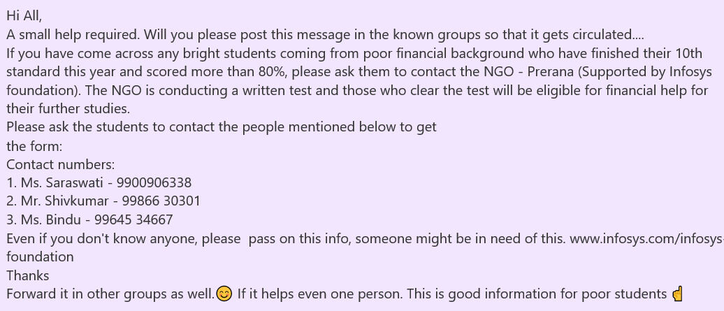 சமூக ஊடகங்களில் கல்வி சம்பந்தமான நிதி வழங்கும் தன்னார்வ தொண்டு நிறுவனங்கள் குறித்த தவறான செய்தி அதிகமாகப் பரப்பப்பட்டு வருகின்றது. தற்போது அதுபோன்று ஒரு வாட்ஸ்ஆப் செய்தியாக, நிதிநிலை கம்மியாக இருக்கும் மாணவர்களுக்கு உதவத் தன்னார்வ தொண்டு நிறுவனமான ப்ரேரணாவை தொடர்பு கொள்ளுமாறு கேட்டுக்கொள்ளப் பட்டிருந்தது.