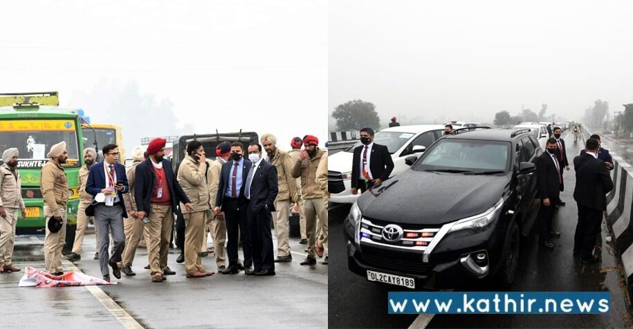 பிரதமரின் காண்வாய், மேம்பாலம் ஒன்றில் செல்லும்பொழுது அந்தப் பாலத்தை திடீரென்று போராட்டக்கார கும்பல் அடைத்து விட்டனர். இந்த பரபரப்பான சூழ்நிலையில் அடுத்த 20 நிமிடம் வரை பிரதமரின் கான்வாய் மேம்பாலத்தில் நிற்கும் நிலை உருவானது.
