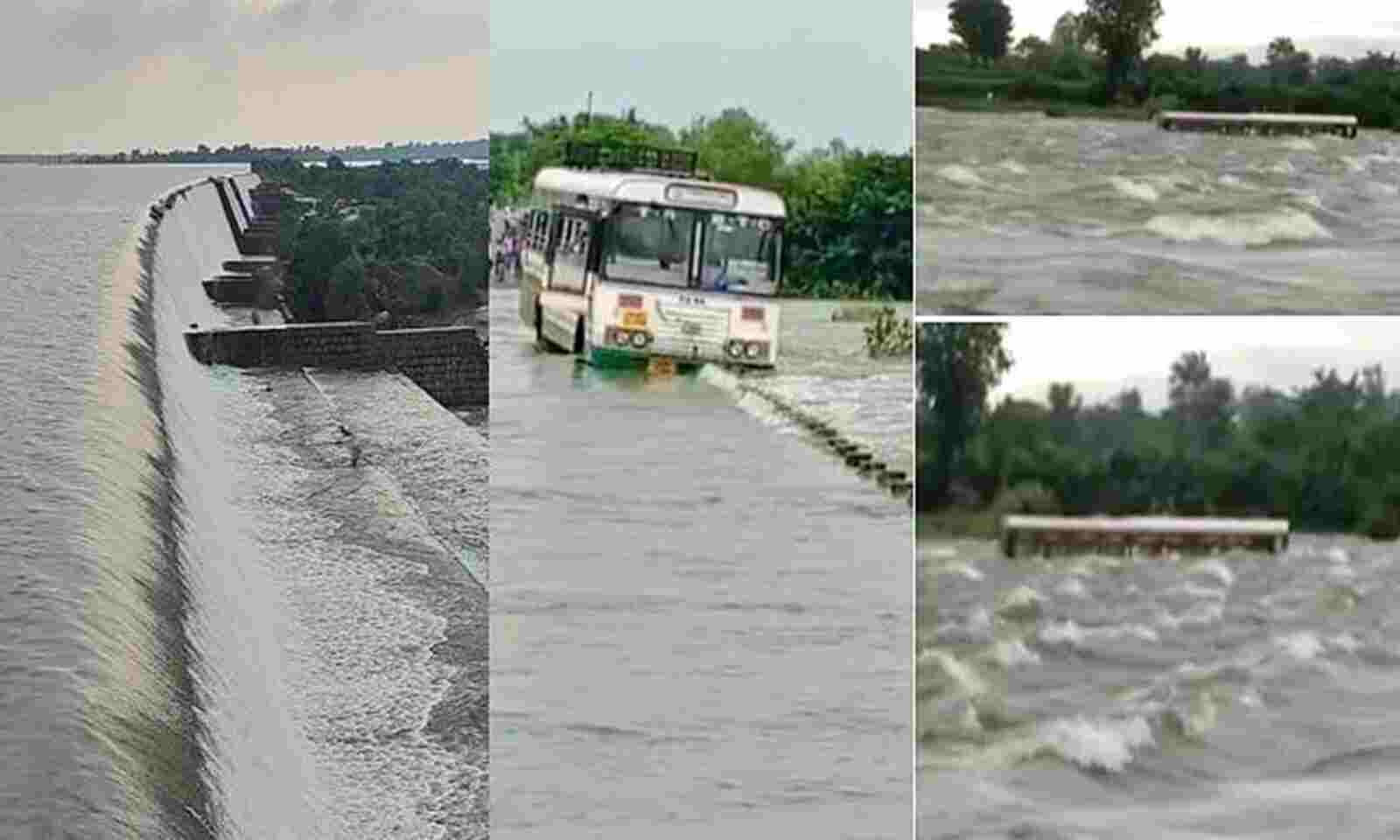 தெலங்கானா சிறிசில்லா மாவட்டம், கம்பீரவுப்பேட்டை, லிங்கண்ணப்பேட்டை இடையே அம்மாநில அரசுப் பேருந்து சென்று வருகிறது. வழக்கம் போல் நேற்று மாலை பேருந்து மன்னேறு ஆற்று கால்வாய் பாலத்தின் மீது சென்று கொண்டிருந்தபோது திடிரென்று வெள்ளத்தில் சிக்கியது.
