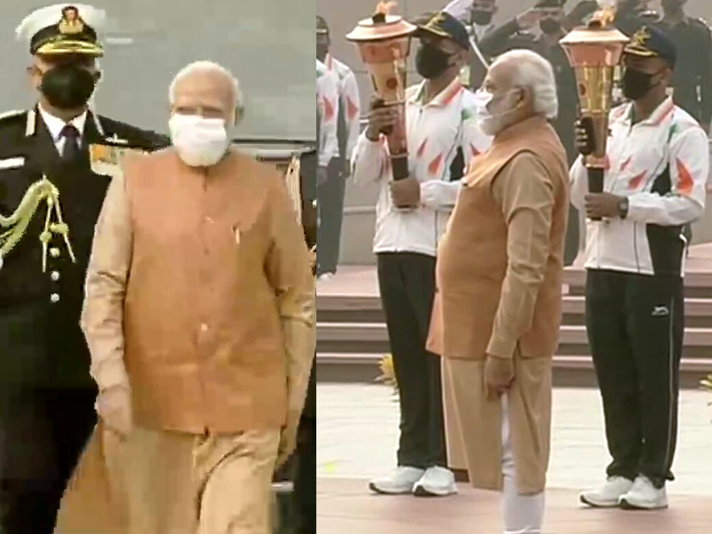 Delhi: Prime Minister Narendra Modi participates in Homage & Reception Ceremony of 'Swarnim Vijay Mashaals' at the National War Memorial, to mark 50th #VijayDiwas pic.twitter.com/5ufIATtsuI