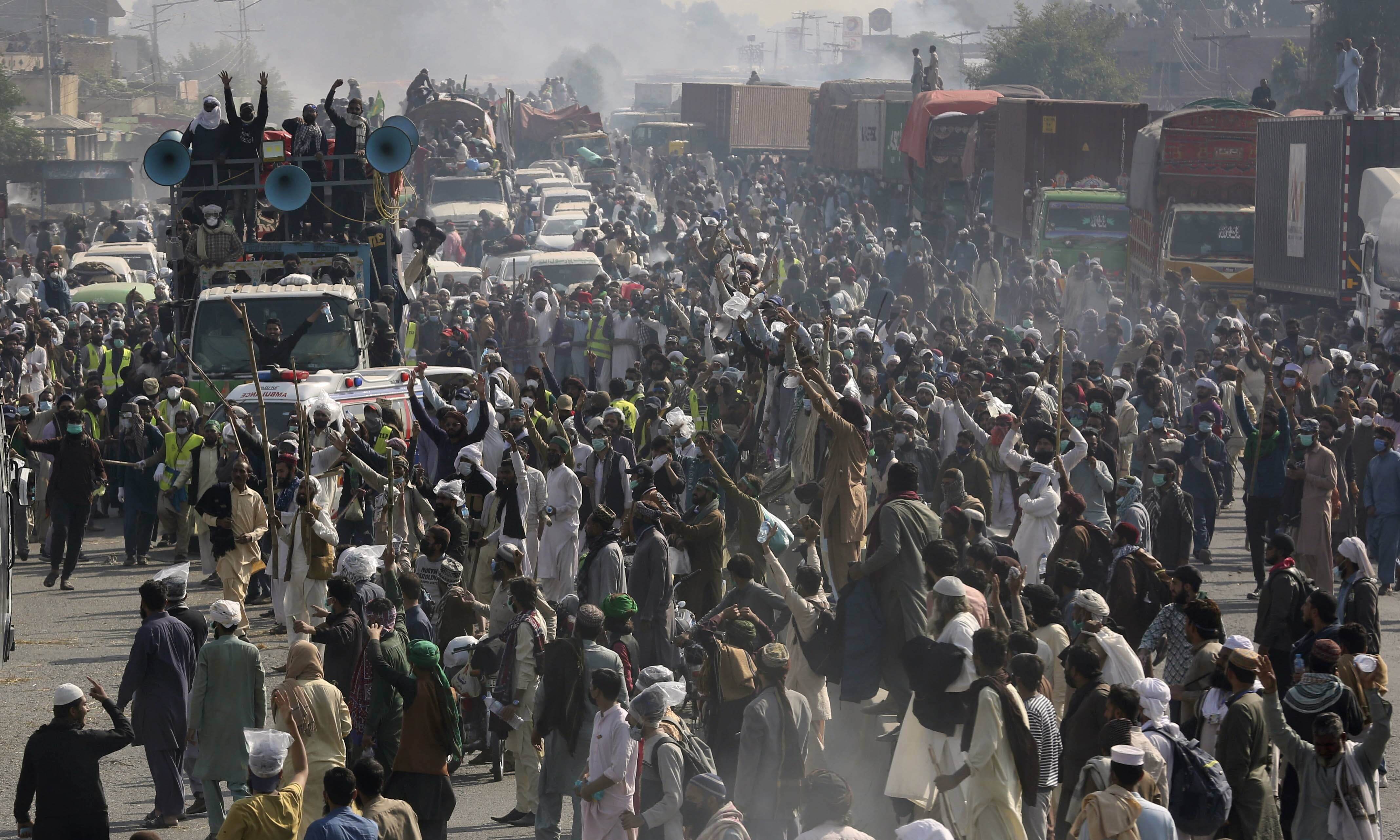 லாகூரில் இருந்து இஸ்லாமாபாத்திற்கு கிட்டத்தட்ட 300 கிலோமீட்டர்கள் (186 மைல்கள்) தொலைவில் "லாங் மார்ச்" (நீண்ட பேரணி) தொடங்கியபோது ஆயிரக்கணக்கான ஆதரவாளர்கள் அக்டோபர் மாத இறுதியில் போலீஸாருடன் மோதினர்.