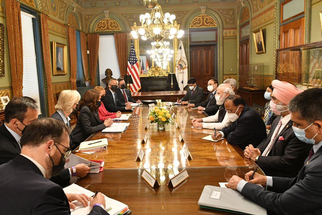 அமெரிக்காவில் மூன்று நாள் அரசு முறை சுற்றுப்பயணம் மேற்கொண்டுள்ள இந்திய பிரதமர் நரேந்திர மோடி அவர்கள் அமெரிக்காவின் வாஷிங்டன் மாகாணத்தில் வந்து இறங்கினார். அங்கு அவருக்கு உற்சாக வரவேற்பு அளிக்கப்பட்டது. அதில் குறிப்பாக அமெரிக்கா வாழ் இந்தியர்கள் அவருக்கு அவருக்கு உற்சாக வரவேற்பு கொடுத்தார்கள். இந்த நிலையில் அமெரிக்க துணை அதிபர் கமலா ஹாரிஸ் பிரதமர் மோடி அவர்களை சந்தித்து பேசினார். அப்போது இருநாட்டு நலன்கள், இந்தோ பசிபிக் மண்டலத்தின் பாதுகாப்பு உள்ளிட்ட விவகாரங்கள் குறித்து இருவரும் பேச்சுவார்த்தை நடத்தினர்.