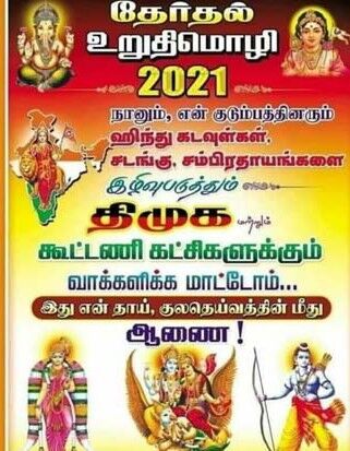 இதனால்பிரசாந்த் கிஷோரின் ஆலோசனையின்படி இந்து மக்களை கவர வேண்டும் என்று பல்வேறு வெற்று அறிவிப்புகளை தி.மு.க. தலைவர் ஸ்டாலின் தேர்தல் அறிக்கையாக வெளியிட்டுள்ளார். இந்நிலையில் இந்துக்கள் யாரும் தி.மு.க.விற்கும் அவர்களின் கூட்டணி கட்சிகளுக்கும் வாக்களிக்கக் கூடாது என்று இந்து அமைப்பினர் வீடு வீடாக சென்று துண்டு பிரசுரங்களை வினியோகித்து வருகின்றனர். அதில் 'நானும் என் குடும்பத்தினரும் இந்துக் கடவுள்கள், சடங்கு சம்பிரதாயங்களை தொடர்ந்து இழிவுபடுத்தி வரும் தி.மு.க. மற்றும் அவர்களது கூட்டணி கட்சிகளுக்கும் வாக்களிக்க மாட்டோம் இது என் தாய் மற்றும் குலதெய்வத்தின் மீது ஆணை!' என்று அச்சிடப்பட்டுள்ளது.