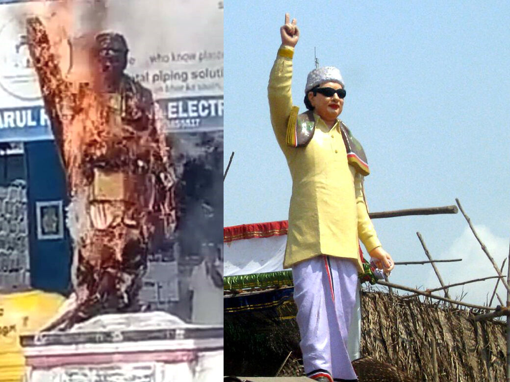தேர்தல் நடத்தை விதி காரணமாக சிலை முழுவதும் துணியால் போர்த்தப்பட்டிருந்தது. இதனால் பட்டாசு கொளுத்தி போட்ட உடன் தீ மளமளவென பற்றி எரிந்தது.