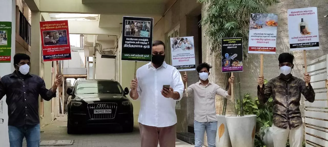 தமிழ்நாட்டில் மதுக்கடைகள் திறக்கப்பட்டதைக் கண்டித்தும், நாட்டு மக்களின் நலன் கருதி முழு மதுவிலக்கை நடைமுறைப்படுத்த வலியுறுத்தியும் சென்னையில் உள்ள எனது இல்லத்தின் முன் மதுவிலக்குக்கு ஆதரவாகவும், மதுக்கடைகள் திறக்கப்பட்டதற்கு எதிராகவும் வாசகங்கள் அடங்கிய பதாகைகளை ஏந்தி அறப்போராட்டம் நடத்தினேன்.