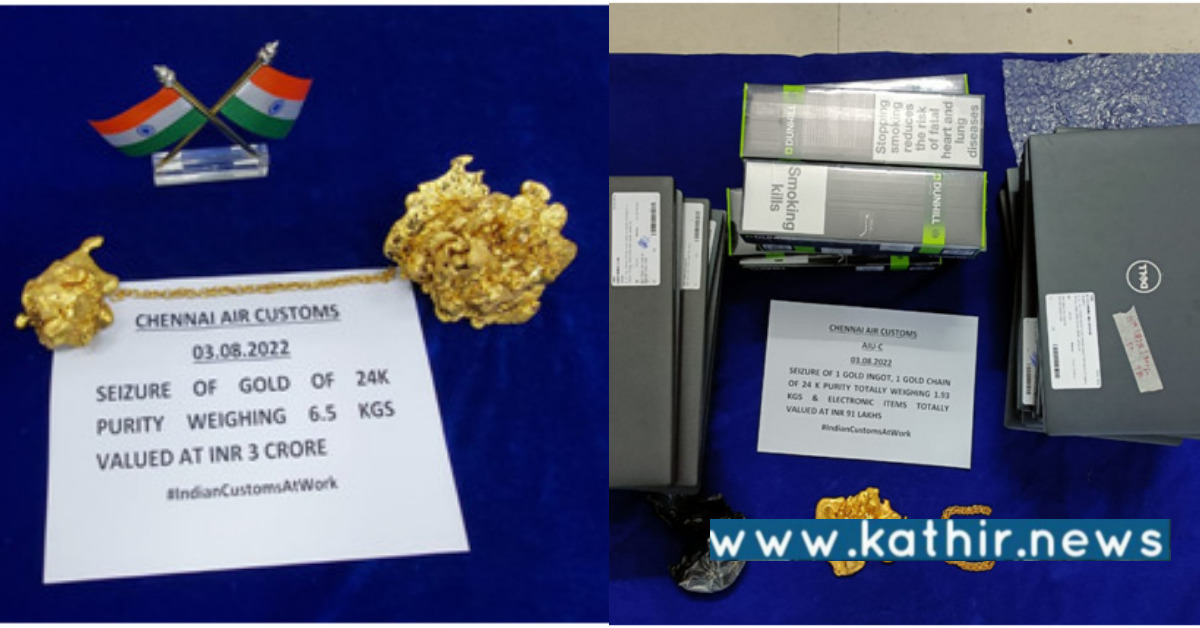 சென்னை விமான நிலைய சுங்கத் துறையின் சோதனை: 6.5 கிலோ தங்கம் பறிமுதல்!