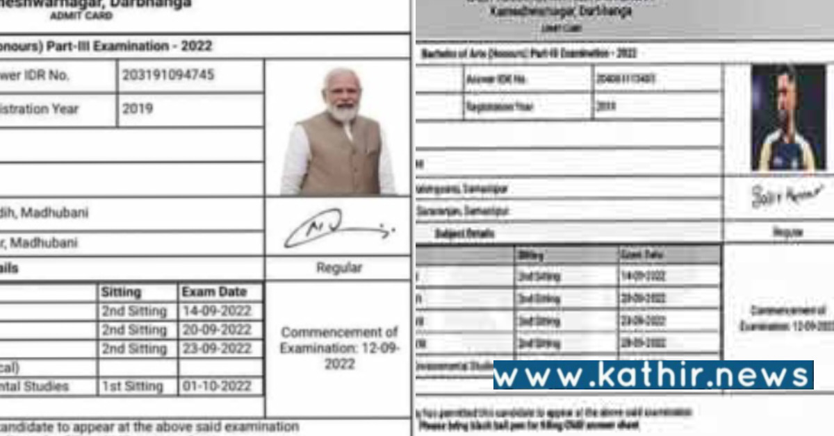 மாணவர்கள் எழுதும் தேர்வில் அவர்களை அனுமதிப்பதற்கான ஹால் டிக்கெட் கல்லூரி நிர்வாகம் சமீபத்தில் வெளியிட்டு இருந்தது. மாணவர்கள் எழுதும் பல்கலைக் கழகத்திற்கான தேர்விற்கு வழங்கப்படும் ஹால் டிக்கெட்டுகளில் பிரதமர் மோடியின் புகைப்படம் இடம் பெற்றிருந்தது சர்ச்சையை ஏற்படுத்தியுள்ளது. பீகாரில் அமைந்துள்ள லலித் நாராயண் மிதிலா பல்கலைக்கழகம் செயல்பட்டு வருகிறது. இந்தப் பல்கலைக்கழகத்தின் கட்டுப்பாட்டில் இயங்கும் கல்லூரிகளின் மூன்றாம் ஆண்டு பயிலும் மாணவர்களுக்கான கல்லூரி தேர்வு நடத்தப்பட இருந்தது. அதற்கான ஹால் டிக்கெட் தற்போது கல்லூரி நிர்வாகம் சார்பில் வெளியீட்டு இருந்தது.