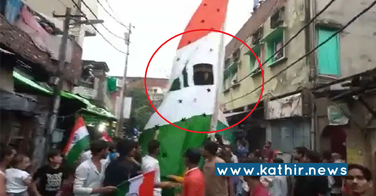 இணையத்தில் வைரலாகி வரும் 33 வினாடிகள் கொண்ட வீடியோவில், இஸ்லாமிய சின்னங்களால் சிதைக்கப்பட்ட மூவர்ணக் கொடியை சில முஸ்லிம் இளைஞர்கள் பிடித்துள்ளனர். கொடியின் மையத்தில் அசோக் சக்கரம் இல்லை, மேலும் அதில் இஸ்லாமிய சின்னங்கள் பொறிக்கப்பட்டுள்ளன.