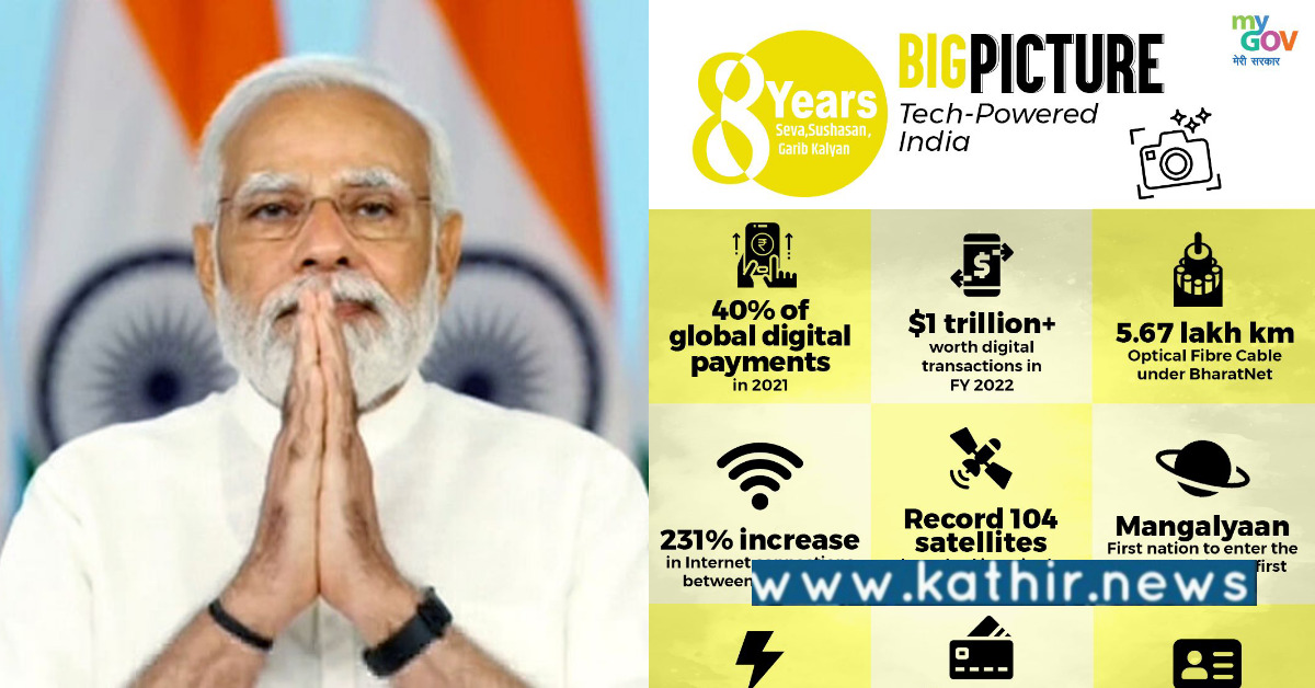 தொழில்நுட்பம் மற்றும் புதுமைகளை ஆட்சி செய்வதற்கும் ஏழைகளுக்கு சேவை செய்வதற்கும் இந்தியா முன்னணியில் உள்ளது. கடந்த 8 ஆண்டுகளில் பொருளாதாரத்தின் ஒவ்வொரு துறையையும் சிறப்பாக மாற்றியுள்ளோம் என்று பிரதமர் நரேந்திர மோடி அவர்கள் தன்னுடைய ட்விட்டர் பக்கத்தில் தெரிவித்துள்ளார். பிரதமர் மோடி தலைமையில், டிஜிட்டல் மயமாக்கலுக்கான உலகளாவிய புரட்சியை இந்தியா நடத்தி வருகிறது. இன்று, இந்திய தொழில்நுட்ப-தீர்வுகள் அவற்றின் சுத்த புத்தி கூர்மை மற்றும் தகவமைப்புத் தன்மைக்காகத் தேடப்படுகின்றன. குறிப்பாக கடந்த 8 ஆண்டுகளில் இந்தியாவின் தொழில்நுட்ப வளர்ச்சி பெற்று வருகிறது.