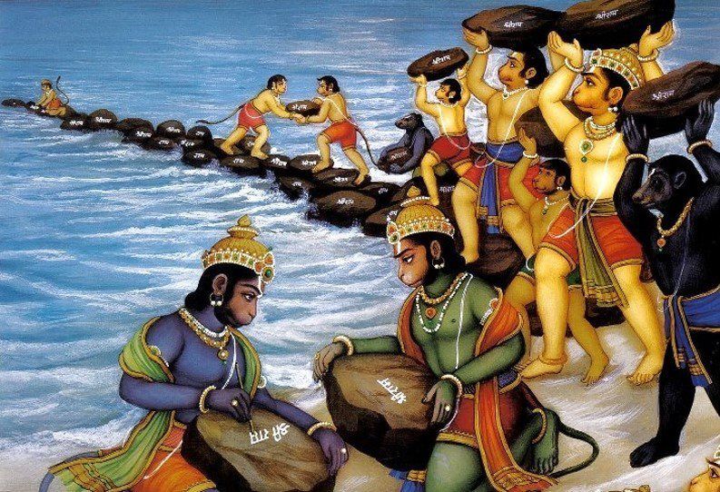 இலங்கைக்கு செல்வதற்காக பாலம் அமைக்கும் பணி துவங்கப்பட்ட போது, பாலம் அமைப்பதற்காக கடலில் வைக்கப்பட்ட கற்கள் எல்லாம் கடலில் மூழ்குவதை கண்டு வருத்தத்தில் ஆழ்ந்திருந்ததாம் வானர சேனை. இதனை கண்ட ஹனுமன் ஒவ்வொறு கல்லிலும் ஶ்ரீ ராமரின் பெயரை எழுதி கடலில் விட்ட போது அவை மிதந்ததாக சொல்லப்பட்டதை கேட்ட ஶ்ரீ ராமரே ஆச்சர்யம் கொண்டாராம்.