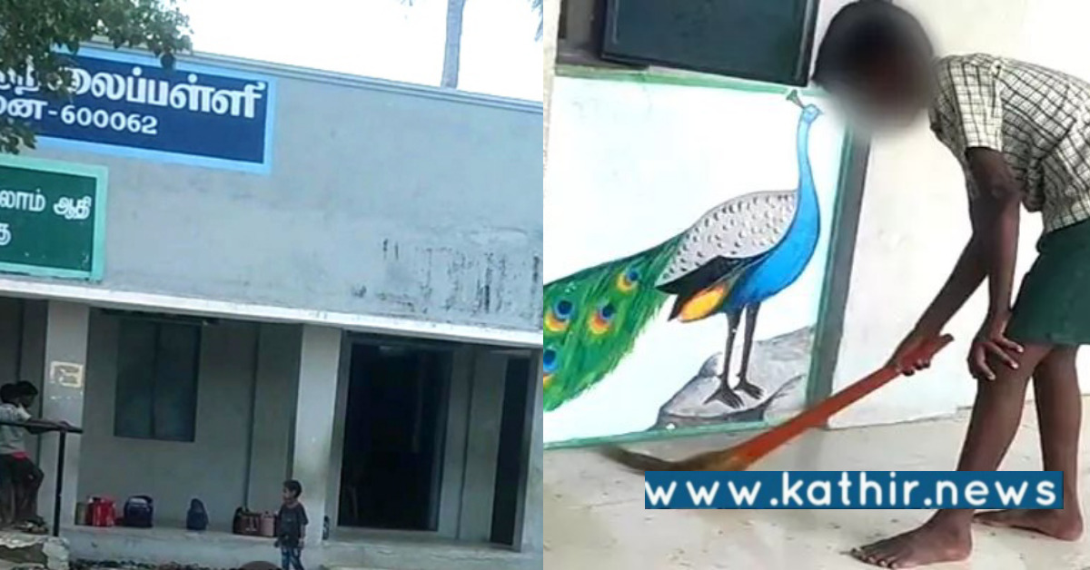 சென்னையில் சிறந்த அரசு பள்ளி மாணவர் ஒருவர் பள்ளி வளாகத்தை பள்ளி சீருடை அணிந்து சுத்தம் செய்யும் நிலைமை.