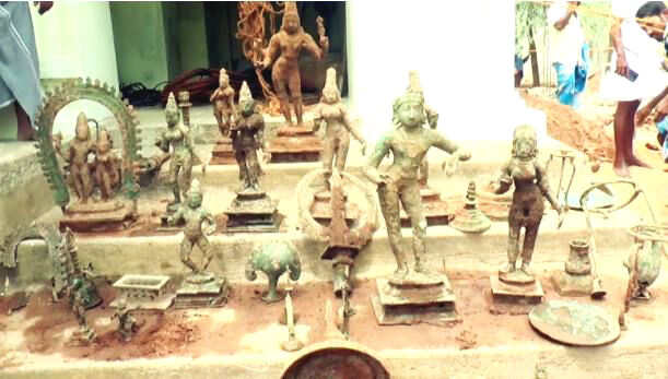 நாகப்பட்டினம் அருகே கோவில் சீரமைப்பின்போது மண்ணைத் தோண்டியுள்ளனர். அப்போது மிகவும் பழங்கால ஐம்பொன் சிலைகளும் பூஜைப் பொருட்களும் கிடைத்து வருவது அப்பகுதி மக்களிடையே பரபரப்பை ஏற்படுத்தியுள்ளது.